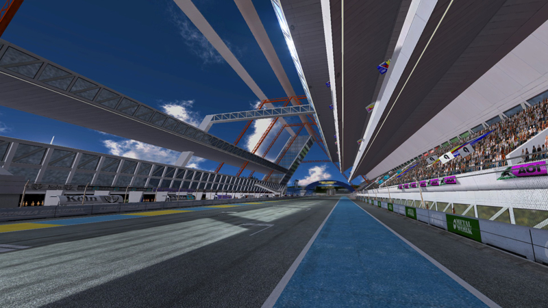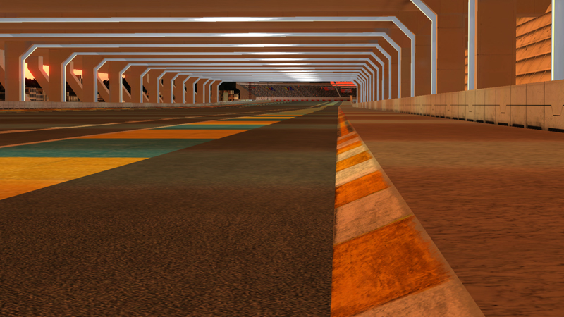 2023年大会仕様の新東京GIOサーキット。特徴的な3層構造のグランドスタンドは健在である。ブースト加速ポイントのロングストレートは、 前年とうって変わってストレートエンドがトンネル内になっているため、先の見えないブラインドコーナーに向け慎重かつ大胆なコーナリングを要する。